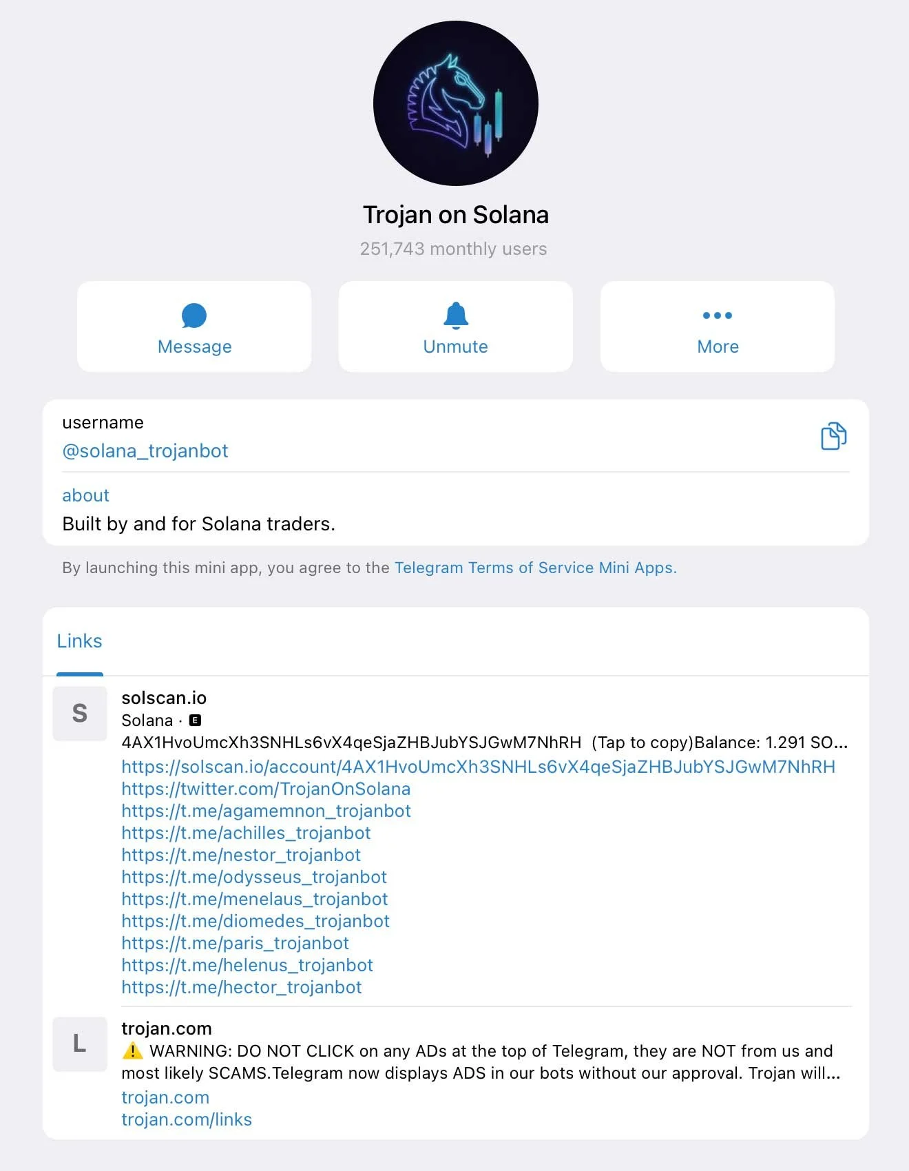Find Trojan Bot: Open Telegram and search for “Trojan on Solana” or use the official link: t.me/solana_trojanbot. This ensures you’re accessing the legitimate bot and not a scam.