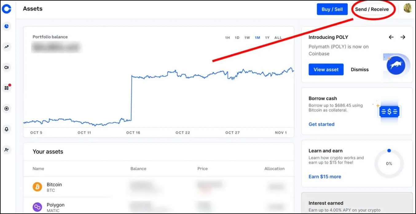 After you have copied your ETH address go back to Coinbase, click Send / Receive: